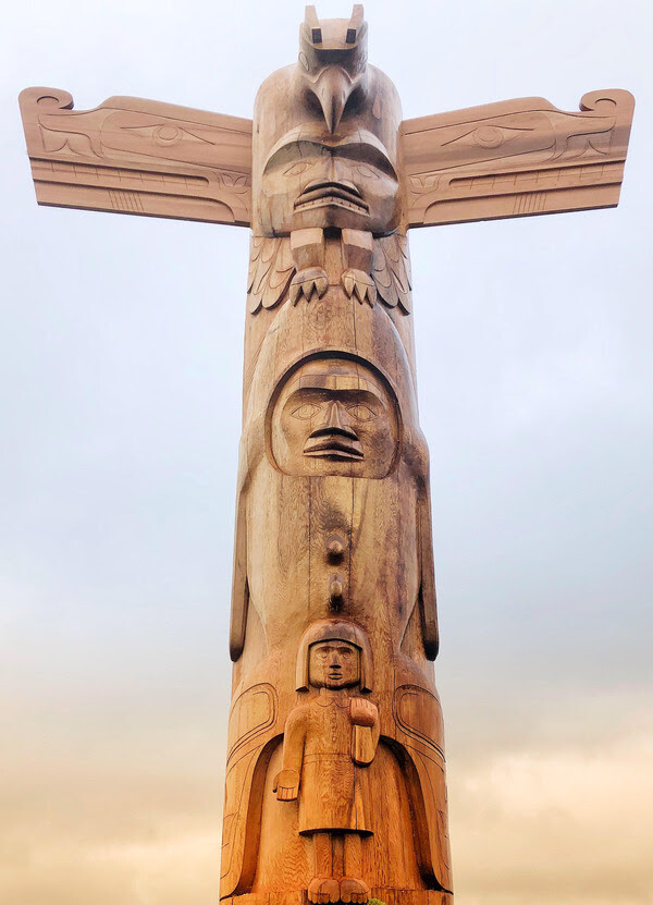 The totem pole or Čiinuł was carved by Joe David honouring the Tla-o-qui-aht Chiefs and their stewardship of the territory. It was raised on September 7, 2018 in Tofino. Photo: Jeh Custerra.